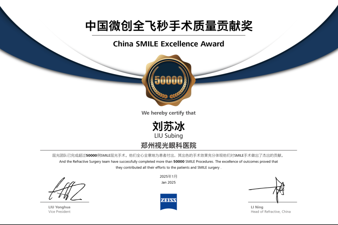 2025年1月20日,郑州视光眼科医院迎来了一个重要时刻:在河南省内率先完成微创全飞秒第50000例手术,蔡司公司为医院和刘苏冰院长颁发了“微创全飞秒50000例手术质量贡献奖”,这是医院继首批升级使用全飞秒精准4.0-VISULYZE技术之后又一里程碑事件,标志着医院在全飞秒激光矫正近视领域开启了新的纪元,迈向新的征程!
